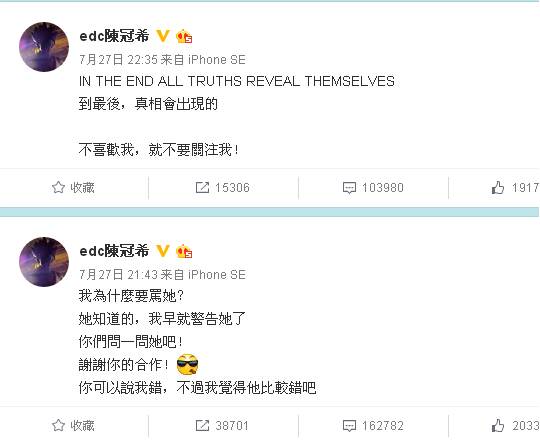 7月27日晚,陳冠希突然在微博用英文辱罵林志玲,隨後迅速刪帖,並再次連發2條微博挑釁。