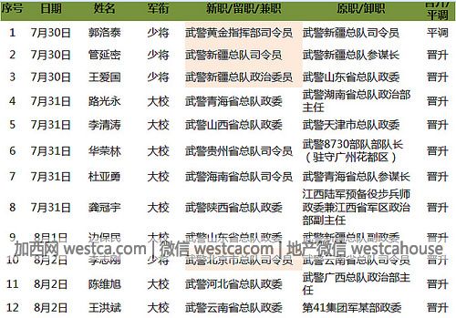 從7月31日至8月2日,武警部隊10個省市總隊和1個警種的12名主官管出現人事大調動,除1人屬平調外,11人全是晉升。其中,獲晉升的大校占3/4,過半是政委;4名少將中,3人從副軍級躋身正軍級。