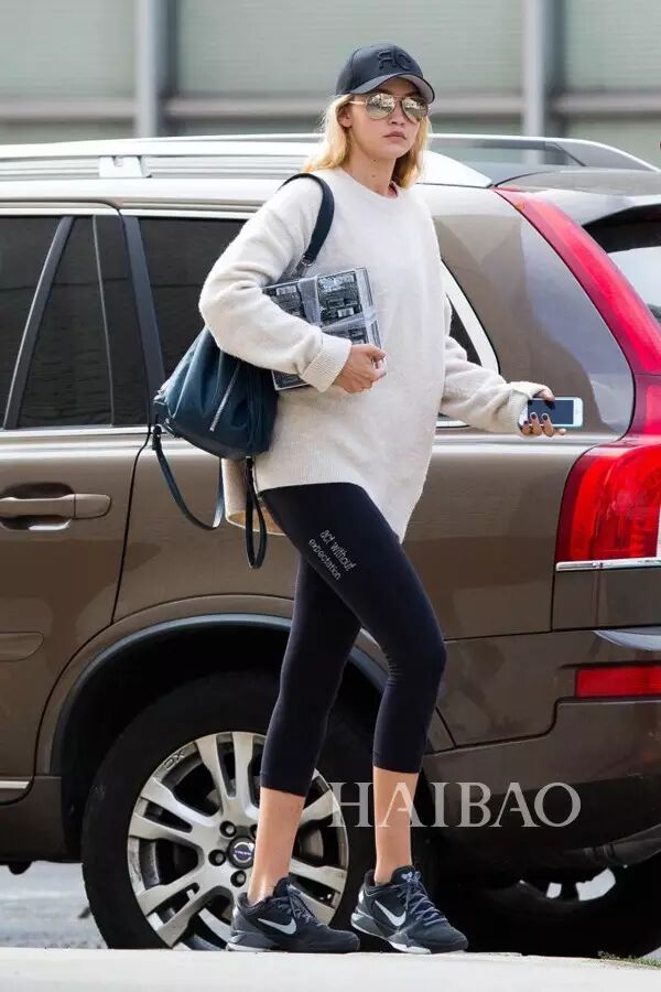 模特吉吉·哈迪德 (Gigi Hadid) 身穿寬松上衣配運動Leggings紐約外出去健身。