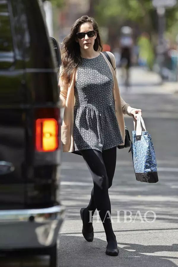麗芙·泰勒 (Liv Tyler) 在紐約West Village出街,碎花連體褲加Leggings和布包舒適簡潔。