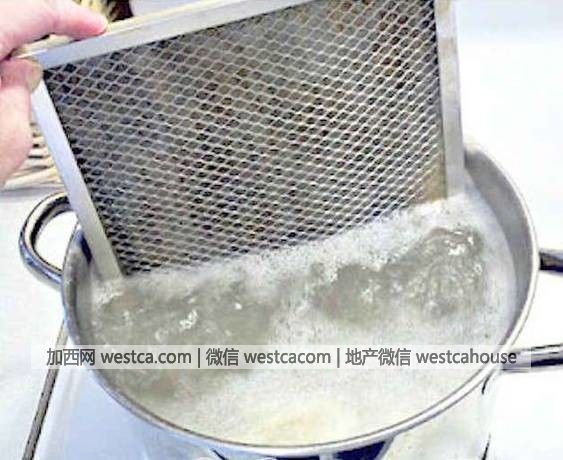 2.網格的清潔。在熱水加入小蘇打,將網格放入容器中,2分鍾之後網格上的油污就不見啦~用白醋浸泡也很有效果~