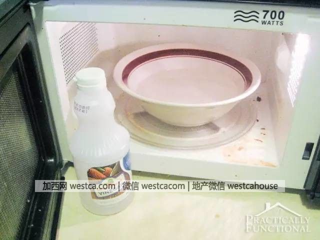 1.將白醋倒進碗裡,再將碗放進微波爐中,加熱5分鍾,白醋加熱後會變成蒸汽,能夠軟化微波爐中的油漬
