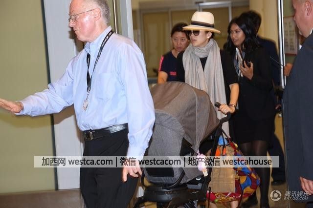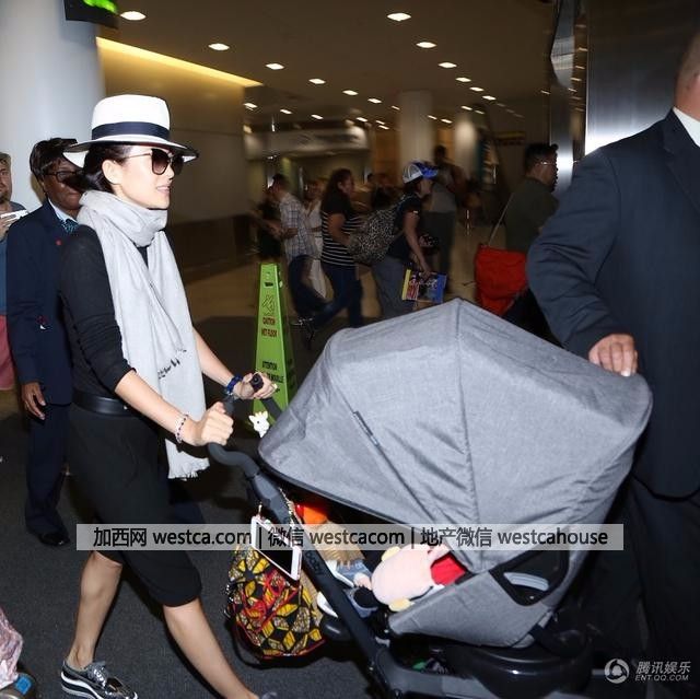 章子怡穿著壹身黑色休閒裝,米色圍巾,黑超遮面白色禮帽,雙手推著灰色兒童車。