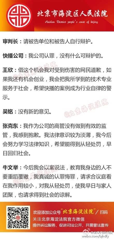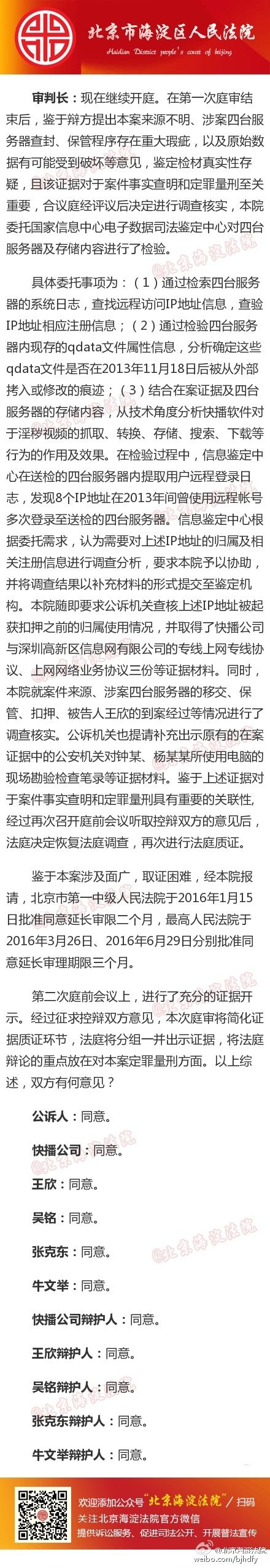 海澱法院於9月9日上午9時30分繼續公開開庭審理被告單位深圳市快播科技有限公司,被告人王欣、吳銘、張克東、牛文舉涉嫌傳播淫穢物品牟利罪壹案。快播公司、王欣、張克東、牛文舉均表示認罪悔罪。吳銘表示快播公司犯罪成立。