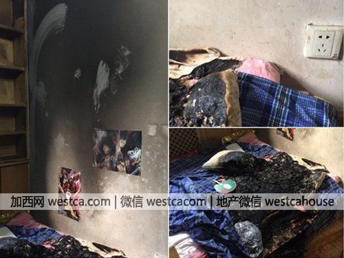 照片所見,毛女士兒子房間牆壁、床褥、被鋪等成焦黑壹片。