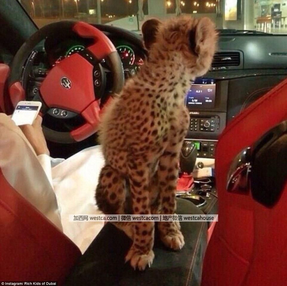 普通人在社交账号上晒的宠物一般是猫猫狗狗,而图中迪拜富二代的宠物是一只猎豹。这只猎豹顺从地蹲坐在一辆玛莎拉蒂豪车中,和主人一起兜风。