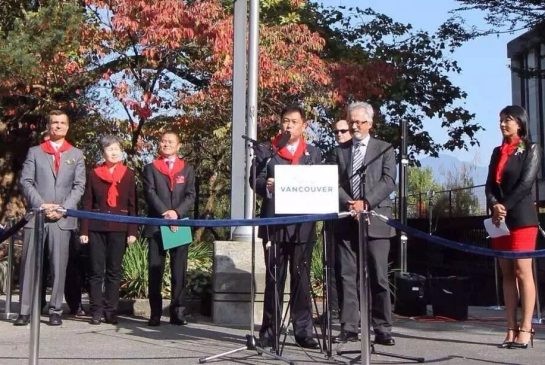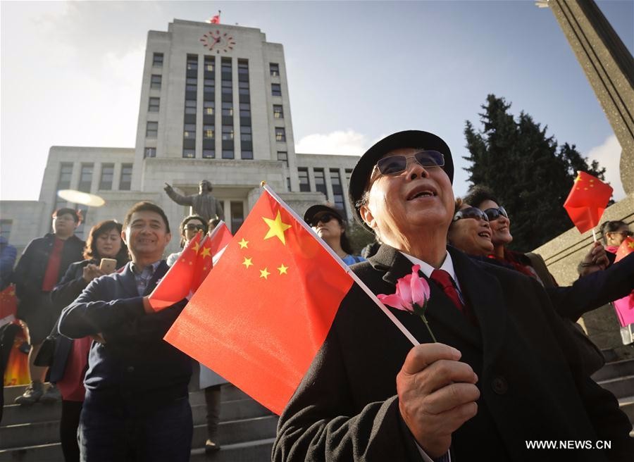 配图为新华社图片,中国国旗在温哥华市政厅升起