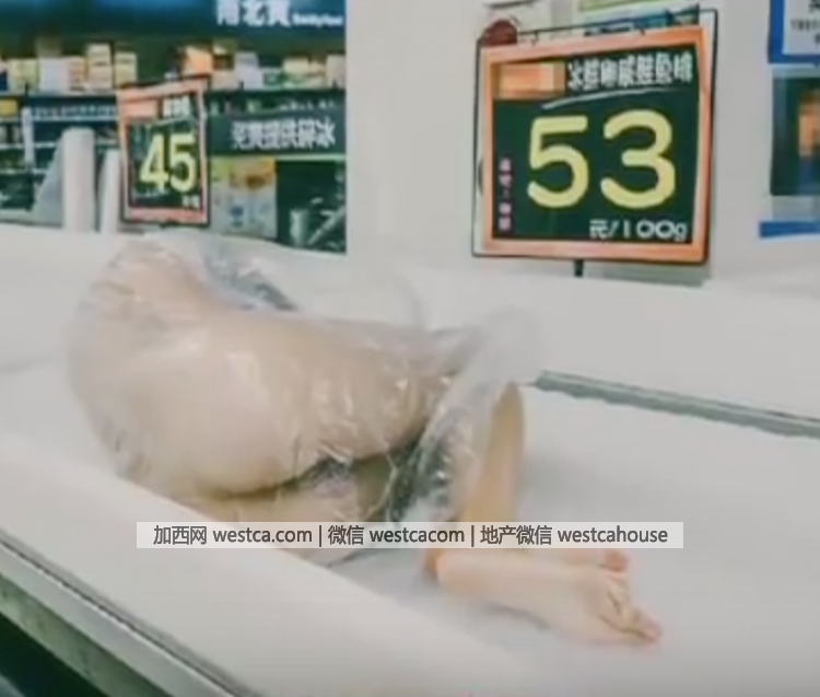 在壹家超市的海鮮攤上,壹位裸體姑娘身上裹著透明的保鮮膜,然後直接躺在海鮮攤的碎冰塊上。