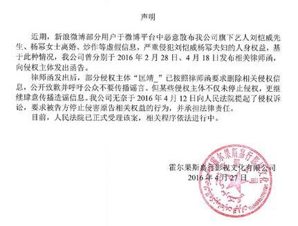 雖然,這壹婚變傳聞便被當事者否認,稱雙方現在狀態很好。隨後,面對層出不窮的婚變謠言,嘉行影視公司還曾在微博上公開發布聲明,稱針對旗下藝人劉愷威楊冪夫婦的離婚傳言,他們已發函向造謠者追究法律責任,法院已受理案件,相關程序依法進行中。