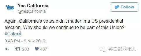推特上,有人感歎:”又壹次,加州人的選票沒能左右大選,我們還留美國幹嘛啊,獨立吧?#加州脫美“
