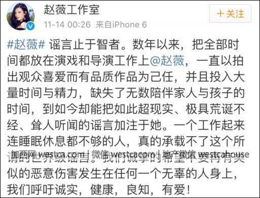 11月14日凌晨,趙薇工作室更新微博,發表聲明對於“趙薇資助希拉裡團隊競選”的謠言予以回應,趙薇工作室附文寫到“謠言止於智者。數年以來,把全部時間都放在演戲和導演工作上@趙薇,壹直以拍出觀眾喜愛而有品質作品為己任,並且投入大量時間與精力,缺失了無數陪伴家人與孩子的時間,到如今卻能把如此超現實、極具荒誕不經、聳人聽聞的謠言加注於她。壹個工作起來連睡眠休息都不夠的人,真的承載不了這個所謂的世界級謠言。我們誠摯的希望不要再有類似的惡意傷害發生在任何壹個無辜的人身上,我們呼吁誠實,健康,良知,有愛!”趙薇工作室在聲明中還表示,對於惡意誹謗者將采取法律手段嚴格追究其法律責任。