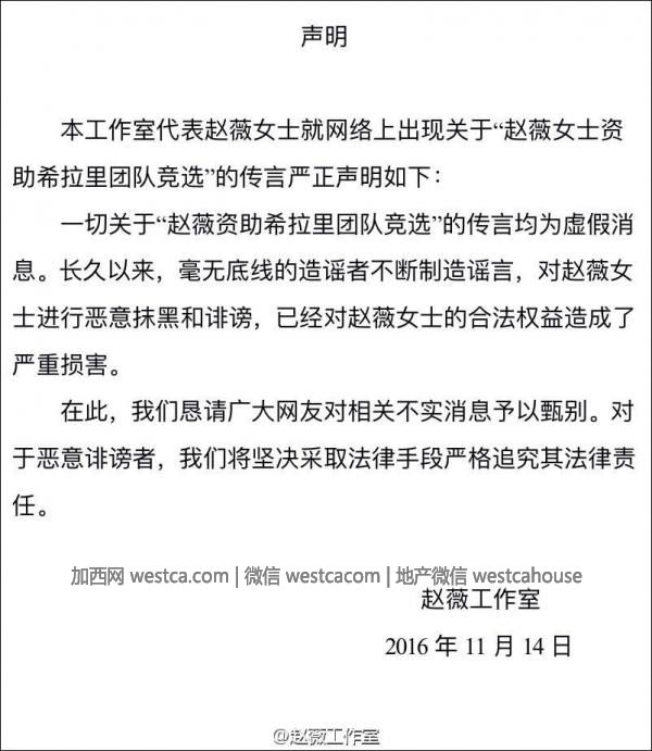 本工作室代表趙薇女士就網絡上出現關於“趙薇女士資助希拉裡團隊競選”的傳言嚴正聲明如下: