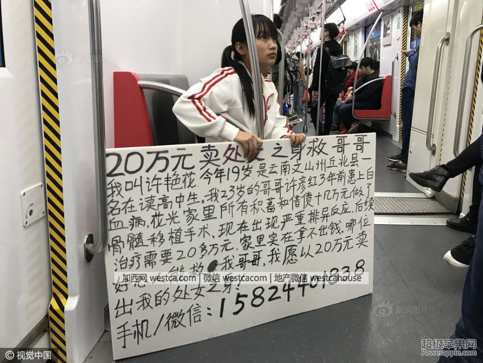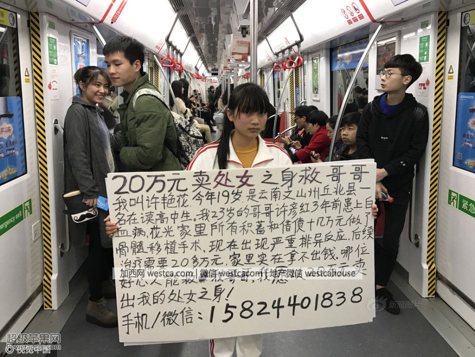 杭州某地鐵內,壹名女孩舉著塊牌子,寫著她19歲,哥哥得了白血病,家裡沒有錢了,現在以20萬元的價格賣自己的處女之身,還附有所謂醫院的“處女證明”。供圖:視覺中國