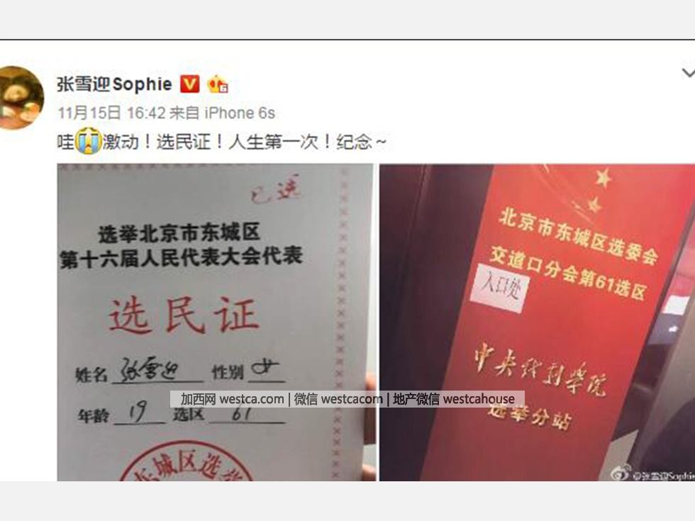 1月15日,內地女演員、學生張雪迎在微博曬出壹張人大代表(中國人民代表大會代表)選民證,激動地表示這是“人生第壹次,紀念”。選民證上年齡19歲引起圍觀,網友也紛紛在評論中曬出自己的選民證。