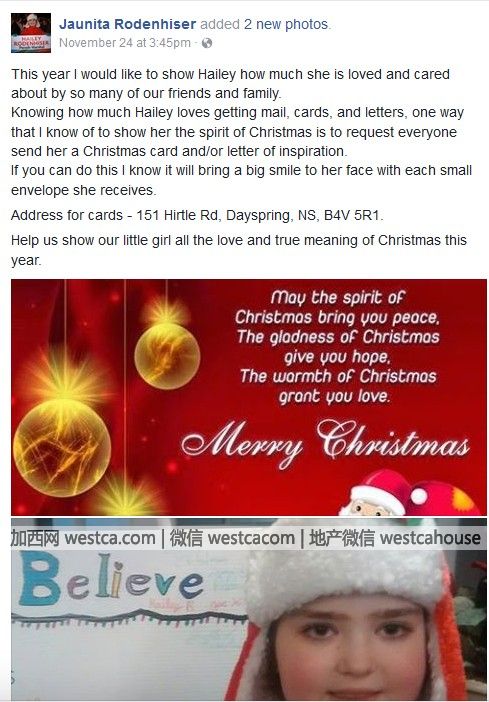 如果你也想寄給Hailey壹張聖誕賀卡,表達壹份關心,她的地址是151 Hirtle Rd,Dayspring,N.S.,B4V 5R1。