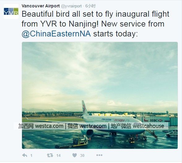 由東航提供溫哥華直飛中國南京的每周叁班的航線於今天正式開。這是溫哥華首次將直航航線拓展到中國歷史名城和重要的經濟中心南京,同時溫哥華也成為了本國境內唯壹提供直航到南京的城市。