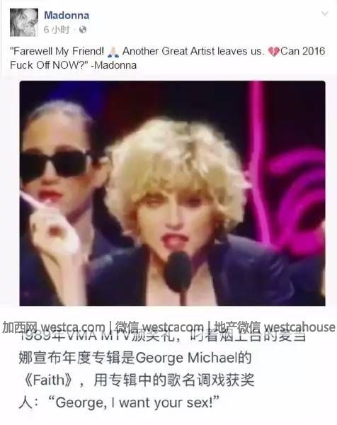 麦当娜也在推特上发表悼文:再见了我亲爱的朋友。又一位伟大的艺术家离开了我们,2016年请赶紧滚蛋好吗?