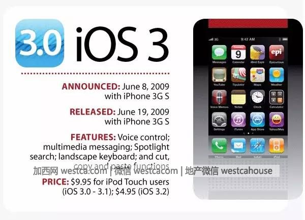 iOS3与iPhone3GS于2009年6月8日发布,iOS3添加许多新功能:语音操控、多媒体信息、Spotlight搜索、横向键盘、剪切、复制和粘贴功能。2010年3月,正式将iPhoneOS的名字改成iOS。