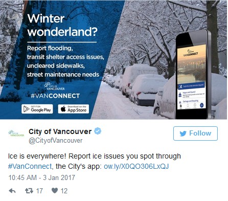 - 溫哥華市府表示,通過市府 app投訴結冰的道路