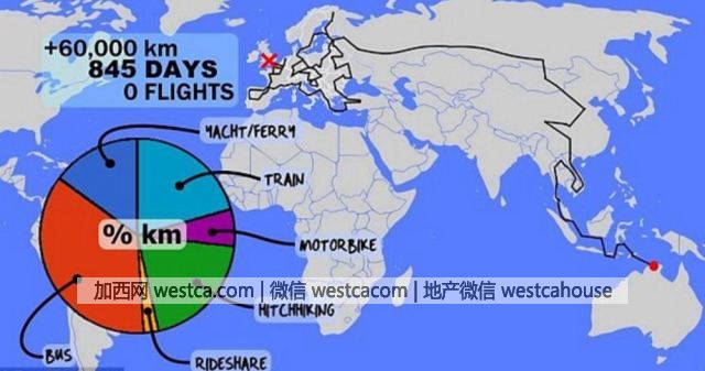 達利特茲2014年從澳大利亞北部的港口出發,在2016年聖誕節前夕到達倫敦,途徑亞歐兩大洲。他的具體路線是:從澳大利亞搭乘游艇到達印度尼西亞,繼而到馬來西亞、泰國,然後騎著摩托車穿過越南,再搭乘西伯利亞鐵路穿過中國、蒙古國和俄羅斯。圖為達利特茲的旅行路線圖。