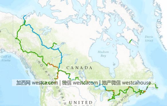 The Great Trail橫跨加拿大境內10個省份和3個地方行政區,從極東的紐芬蘭省壹路橫跨北美大陸至西岸的卑詩省,再蜿蜒向北,直達北極圈附近的育空地區北極海沿岸。原本只是各個省分原有的小徑,在非營業團體Trans Canada Trail 的計畫、籌款、肆處奔走與說服之下,逐漸將散落各地斷斷續續的路徑接續起來。完成後路徑將達2萬4千公裡,將是世界最長的健走路徑,成為除了開車之外,人們游覽加拿大的另壹種方式。(截至2017/1/1為止,已完成21,000公裡,串聯90%)