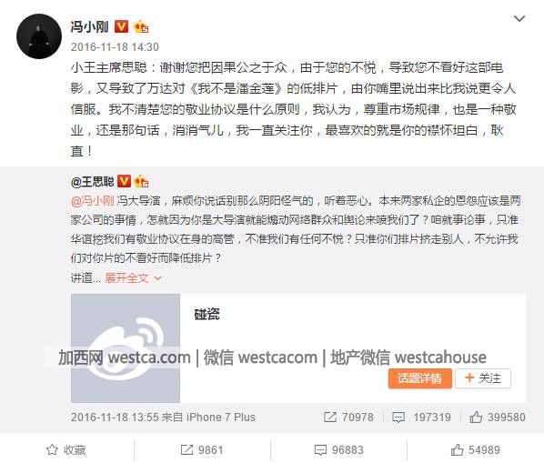 因為電影《我不是潘金蓮》的排片問題,著名導演馮小剛與萬達少東家王思聰在微博上展開罵戰,這是2016年影視圈最火爆的壹個話題。