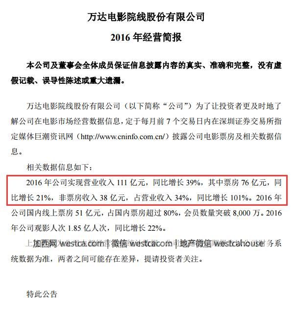 答案出現在萬達院線1月10日晚間公布的壹份公告,內容是萬達院線2016年經營簡報。
