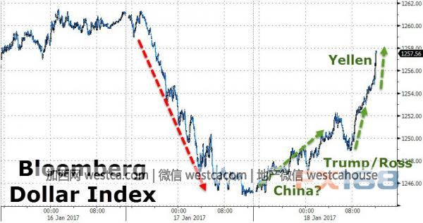 在耶倫講話後,美元全面上漲,兌歐元飆升1.5%。周叁紐約尾盤,美元指數大漲0.95%,報101.26,此前周贰曾觸及12月8日來最低水准。