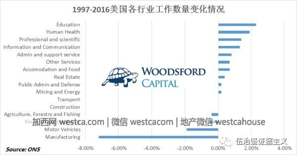 在过去20年中,美国的经济结构继续从第二产业(制造业)向第三产业(服务业)发生转移。在所有行业中,失去工作机会最多的行业就是制造业和汽车行业。另外两个深受打击的行业是金融保险(由于2008年的金融危机)和农业。与之形成鲜明对比的,工作机会增长最快的行业是教育,医疗,科学和信息科技这些行业。