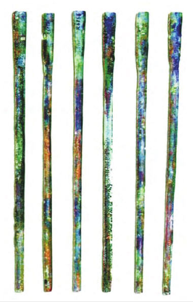到了安阳殷墟里,箸的实物发现已经很普遍了。二十世纪三十年代在河南安阳殷墟西北岗祭祀坑出土六件青铜箸头,长25.9-26.1厘米。另在商代晚期的一座墓葬中,也发现了青铜箸,现存亦仅为箸体的一部分,较短,是箸上部的铜结构部分,完整的箸还应有套接榫卯的竹或木杆。