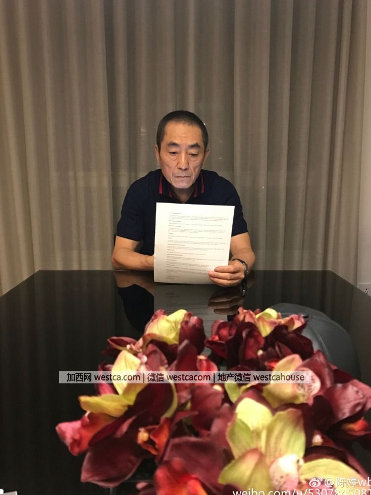 照片里张艺谋坐在桌子一端,正全神贯注地看着文件。张艺谋眉头微蹙,神情严肃,但看上去精神头还是不错。