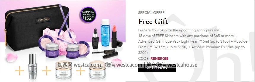 Lancome 加拿大官網現有特價區彩妝全場8折,無需折扣碼。滿$65即送15天護膚豪華小樣,滿$100加送大眼精華眼部精華肌底液5ml,滿$150加送金純卓