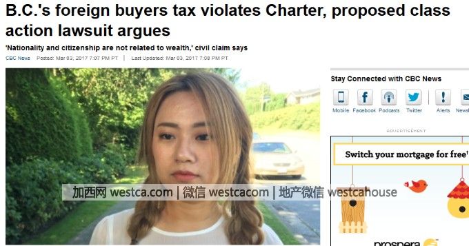 BC省為冷卻溫哥華地區過熱的住房市場,於去年秋天推出BC省外國購房者征收15%的稅收政策。日前有中國人發起集體訴訟,指這個稅法違反了加拿大的“權利和自由憲章”,並提出索賠。