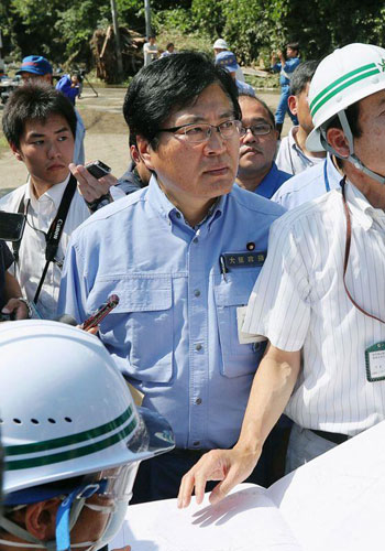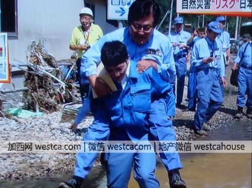 務台俊介去年視察台風災區時,因沒帶雨鞋,被隨行職員背著涉水 。