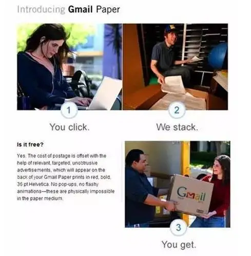 谷歌在2007年愚人節策劃了壹個Gmail的信件事件,告訴Gmail用戶谷歌可將電郵轉為實體紙張,然後免費寄到用戶家中……