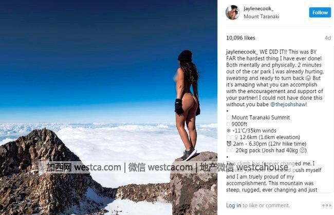 现年25岁的花花公子女模库克( Jaylene Cook)和其男友于当地时间周三,经过12小时的徒步,爬上当地毛利人的圣山,并拍下她自称为”感受自由“的照片。
