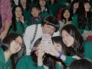資料圖:豬哥亮與女學生們合影。圖片來源:台灣“聯合報”