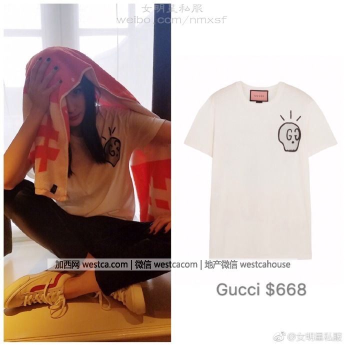 不要忘了楊冪在江湖的稱號----“帶貨女王”,所以她出鏡還意味著壹大波商機襲來啊!沒幾個小時,楊冪全身上下都被扒了出來,這款看起來沒什麼特色的白t是Gucci,668元,准備下單了,但是看清楚了,是美元。手動再見!