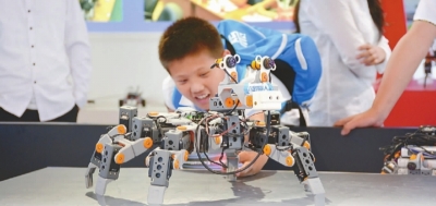 北京國際科技產業博覽會上,市民與六足機器人互動。趙晨光攝 光明圖片/視覺中國
