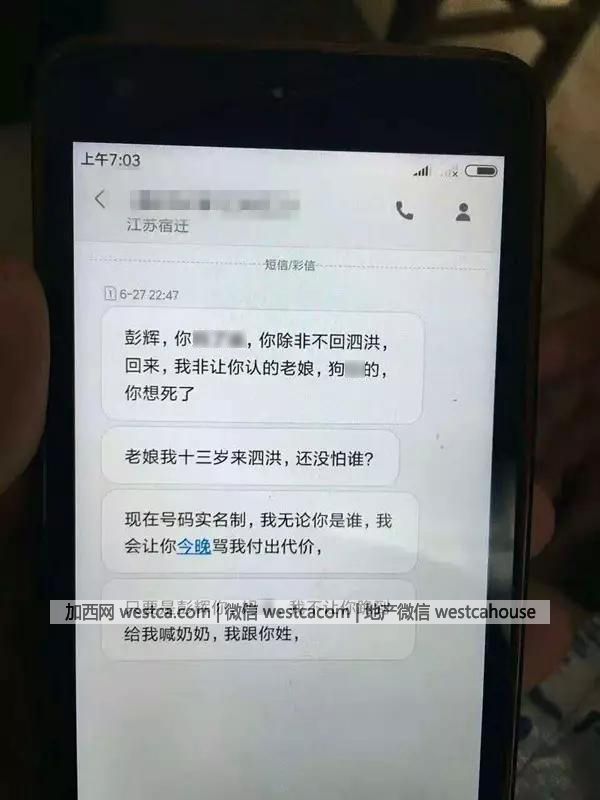 截圖顯示,朱芳華自稱為“老娘”,表示“老娘我拾叁歲來泗洪,還沒怕誰”,“只要是彭輝你,我不讓你跪倒給我喊奶奶,我跟你姓”,短信中還夾雜有很多下流髒話,言辭不堪入目。