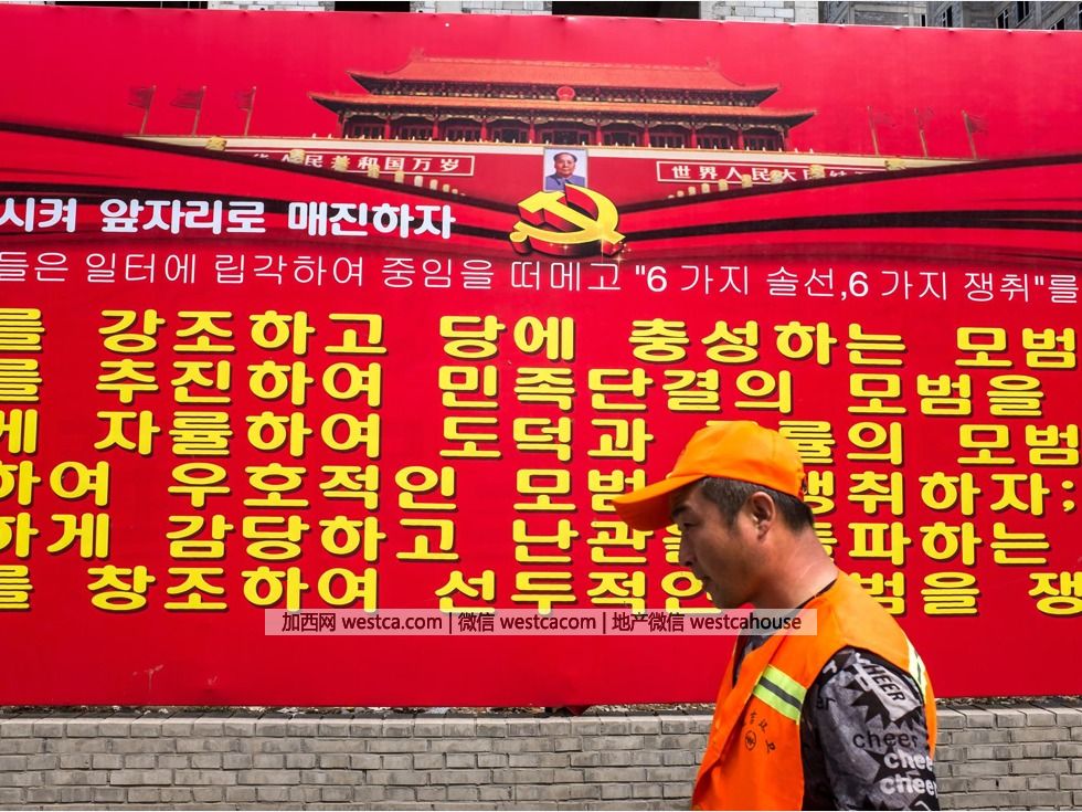 在延邊州的很多地方,朝鮮族元素隨處可見。壹位環衛工人走過壹塊寫著朝鮮族文字的宣傳牌。(圖源:VCG)