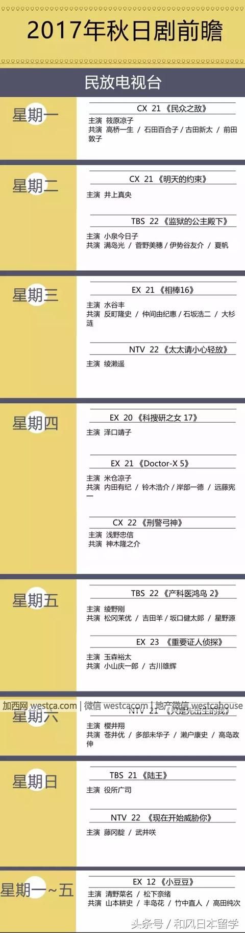 2017年秋日劇前瞻,老規矩,奉上圖表,分別歸類為“民放電視台”、“NHK電視台”、“深夜劇”、“付費電視台”、“網絡劇”和“SP”。