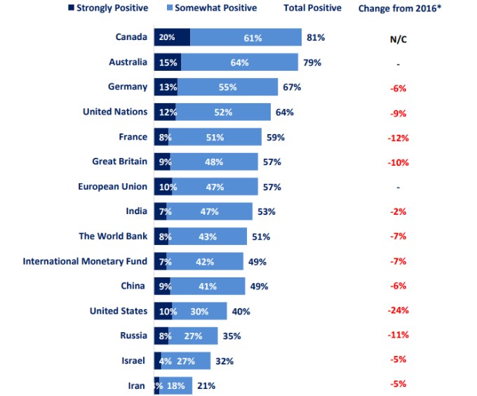 其他國家對美國的看法在過去壹年發生顯著地變化,美國僅排在第15位,只有40%的受訪者認為美國對當今世界事務有積極的影響。相對壹年前下降了24個百分點,當時美國排名第柒位。