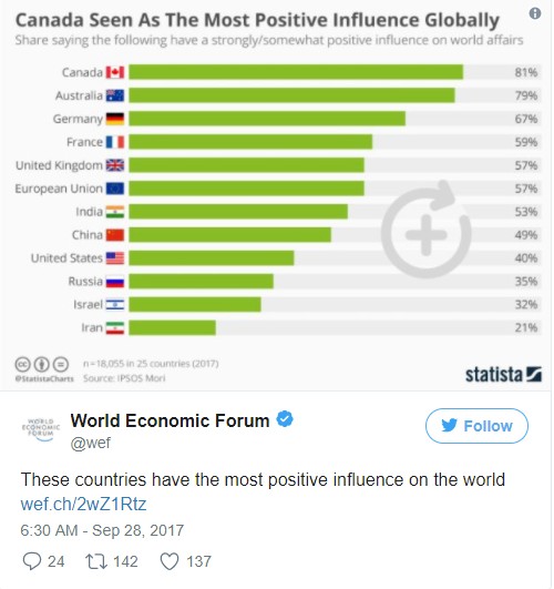 (加西網綜合)根據壹項對全球25個國家的民調,“對世界有積極影響”,加拿大以81%的好感度排在首位,活活甩“全球老大”的米帝好幾條街!
