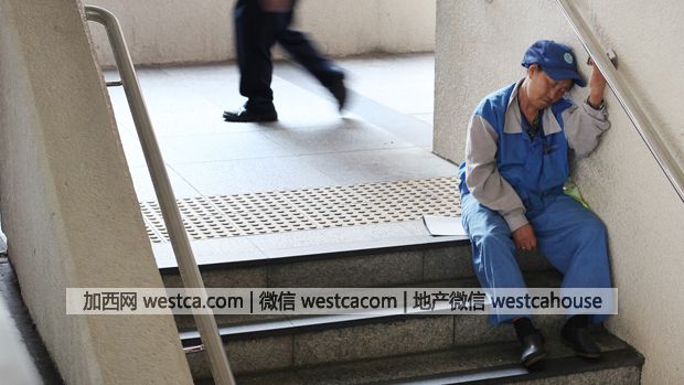 2010年5月5日,香港壹名清潔工在行人路上打瞌睡。(法新社)