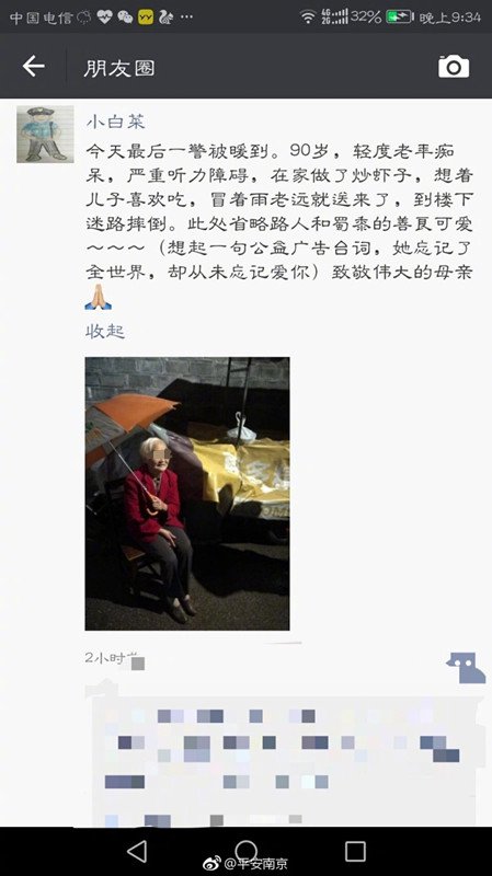 雨夜,壹位白發蒼蒼的老媽媽去給兒子送他最喜歡吃的菜,結果卻迷路摔倒。10 月 16 日晚上,壹張老人的照片在微信朋友圈瘋傳。發出照片的是南京秦淮公安分局朝天宮警務工作服務站的民警魏岩,他接到報警後救助了這位老人,並最終將菜送到了她兒子手上。現代快報記者了解到,老人有輕微的老年癡呆,但她壹直都沒有忘記,兒子最愛吃的菜是什麼。