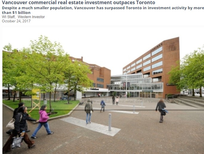 (加西網綜合)盡管溫哥華的人口(240萬)同多倫多(640萬)相比要少得多...但是溫村的投資活動超出了多市10多億元!!!