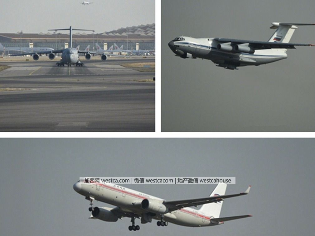 北京時間11月2日,在北京首都國際機場跑道內,美國C-17運輸機(左上)、俄羅斯伊爾-76運輸機(右上)、朝鮮客機齊聚(下),頗為罕見。(圖源:@航空物語)
