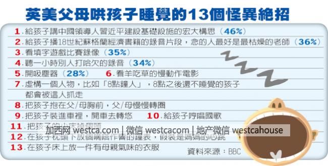 報導指出,民調機構為睡眠研究應用軟體(Calm.com和Moshi Twilight Sleep Stories)所做的壹項調查,結果真是讓人大開眼界,給孩子講中國國家領導人習近平建設基礎設施的宏大夢想,以46%的選票榮登哄孩子睡覺的13個怪招榜首。其他的還包括給孩子播18世紀蘇格蘭經濟書籍的錄音片段,念的人最好是最枯燥的老師、看填字游戲比賽錄像等。