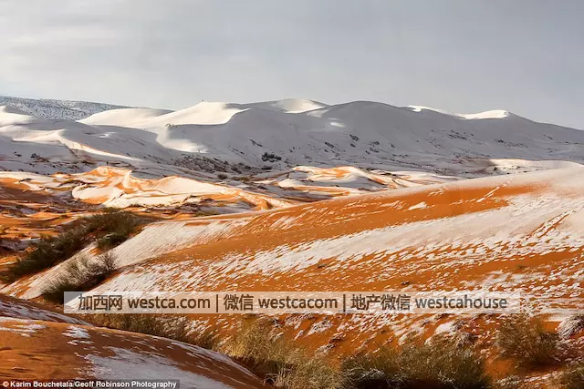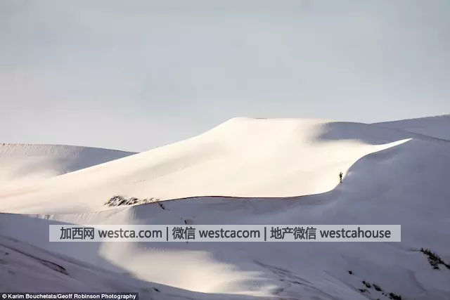 Karim Bouchetata 带着相机前往撒哈拉沙漠,记录下了大片大片白雪将红色的撒哈拉沙漠全部覆盖的景象。